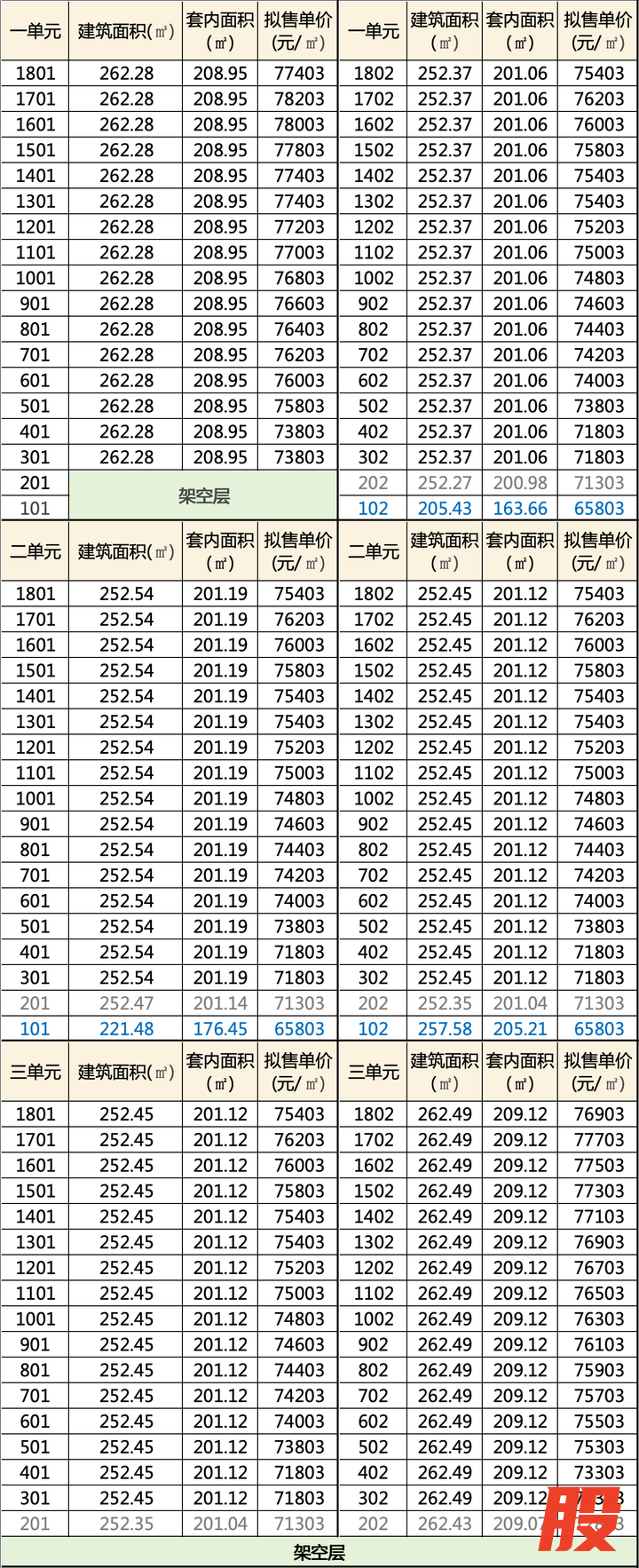 三个单元,边户建面约262㎡,中间户约252㎡。 拟售均价7.48万元/㎡。