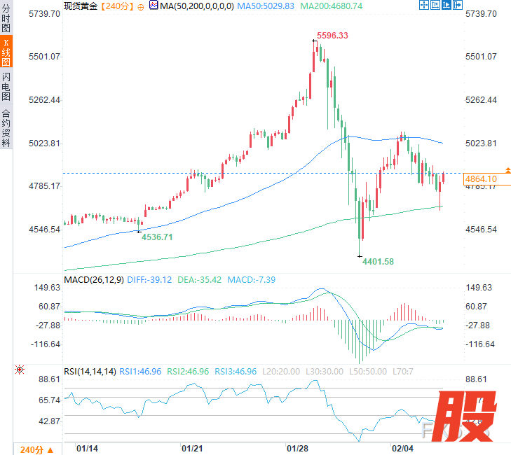 (现货黄金4小时图,来源:易汇通)北京时间14:06,现货黄金现报4878.73美元/盎司。